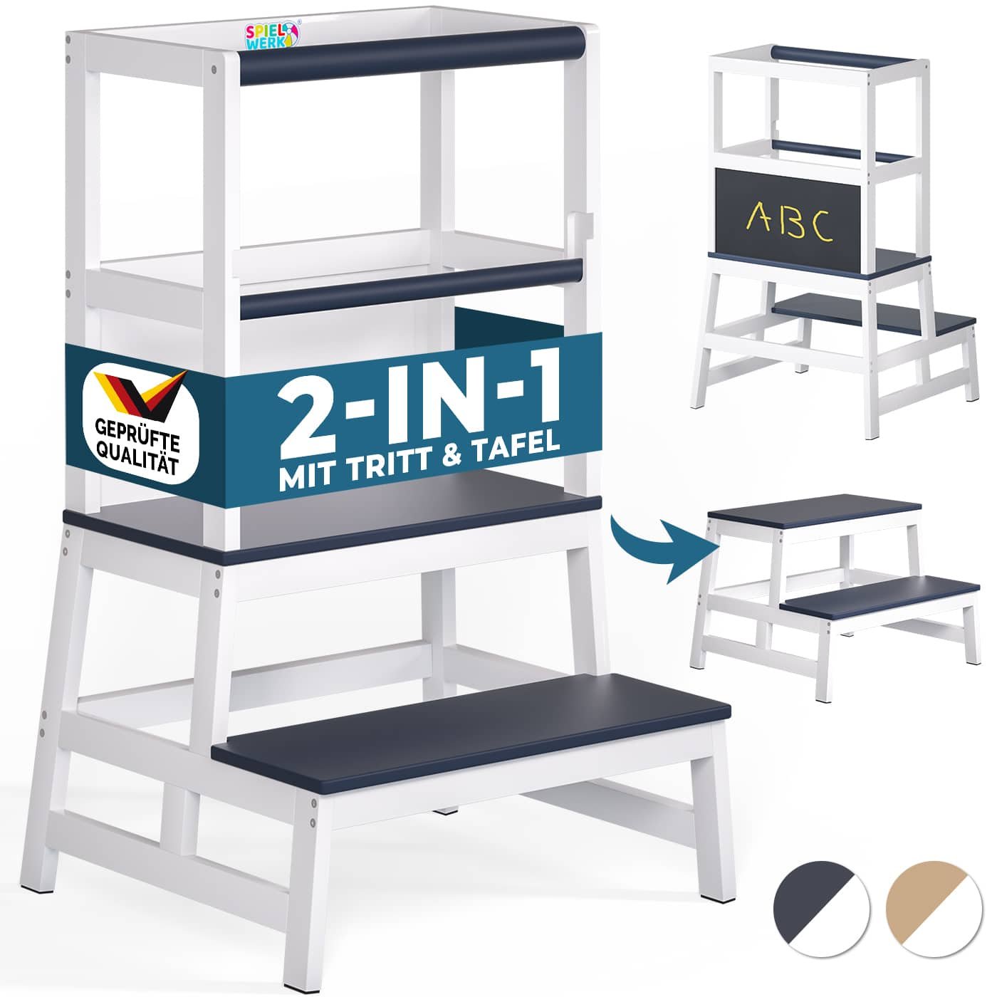 Produktfordele: Stabilt børnelæringstårn i trapezformet design for optimal stabilitet 2 beskyttelsesstænger – for endnu mere sikkerhed afrundede kanter håndværk af høj kvalitet, praktisk og holdbart perfekt højde til køkkenelementer ekstra bred ståflade S